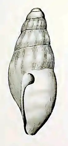 (Original description) The short, solid shell is narrowly oval, with a blunt apex and a slightly contracted base. The protoconch consists of two smooth, slightly convex whorls. The four whorls of the spire are sloping scarcely convex. The sutures are linear. The aperture is oval, slightly contracted behind, opening widely into a very short siphonal canal in front. The outer lip is simple; with a shallow, round sinus near the suture, a convex profile, and a very faint sinus anteriorly. The inner lip shows a complete, applied narrow glaze. The columella is straight and slightly bent to the left in the siphonal canal. There are faint oblique axial ribs, equal to the interspaces. The shell shows well-marked crowded sinuous incremental striae. There is no spiral sculpture. The colour of the shell is light brown, with a band of lighter colour on the middle of the spire-whorls, whitish where it crosses the ribs. There are three light bands on the body whorl.[2]
