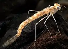 The larvae of this species are between 17 and 21 millimetres in length and have a broad head with large eyes, a cylindrical body shape and a rounded tip on the tail gill with no hairs, and three horizontal brown stripes.[8][10]
