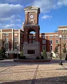 On November 3, 2010, the Autherine Lucy Clock Tower was dedicated in a new space honoring her, Vivian Malone, and James Hood (the Malone-Hood Plaza)—three individuals who pioneered desegregation at the University of Alabama.[4] The Plaza is located beside Foster Auditorium, where, in 1963, Alabama Governor George Wallace unsuccessfully attempted to bar Malone and Hood from registering at the University.[24] The 40-foot-tall (12 m) brick tower has a base displaying bronze plaques that chronicle the individual struggles of Lucy, Malone, and Hood. Additionally, on September 15, 2017, a special marker was erected in her honor near Graves Hall (home of the College of Education) on the UA campus.[25] Lucy returned to speak at the ceremony and compared the crowd that welcomed her with the hatred she had encountered the first time she entered the university.[26]