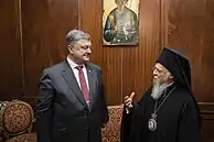 On 17 April, Ukrainian President Poroshenko met in Turkey with the Ecumenical Patriarch and made an appeal, supported by various Ukrainian MPs,[54][55] for the granting of autocephaly to Ukraine;[56][57] both parties reached an agreement after a 7-hour long negotiation.[56] The full appeal was later published on the official website of the president of Ukraine.[54] The UOC-KP and the UAOC also sent a similar appeal to the Ecumenical Patriarchate in what Poroshenko described as "a rare united move of the two churches [the UOC-KP and the UAOC]".[56][58] On 18 April, the draft resolution on the support of Poroshenko's appeal was submitted to the Ukrainian parliament, and on 19 April it was adopted.[59][60] The text of the appeal of the Ukrainian parliament was longer and contained more arguments in favor of Ukraine's autocephaly compared to Poroshenko's appeal.[lower-alpha 1] On 20 April, the official request to issue a Tomos of Autocephaly was delivered to the Ecumenical Patriarchate.[61] On the same day, 20 April, the Holy synod of the Ecumenical Patriarchate "voted to proceed with taking the necessary steps for granting autocephaly to the Orthodox Christians of Ukraine".[62] On 22 April, the Ecumenical Patriarchate issued an official communiqué declaring that the synod had "examined matters pertaining to the ecclesiastical situation in Ukraine, as done in previous synodal sessions, and having received from ecclesiastical and civil authorities [...] a petition that requests the bestowal of autocephaly, decided to closely communicate and coordinate with its sister Orthodox Churches concerning this matter."[63][64] The same day, President Poroshenko declared on his official Facebook page that "the Ecumenical Patriarchate had commenced the procedures necessary for granting autocephaly to the Ukrainian Orthodox Church."[65][66] The agreement assigned the property of Ukrainian churches and monasteries to the autocephalous Ukrainian Orthodox Church.[67]