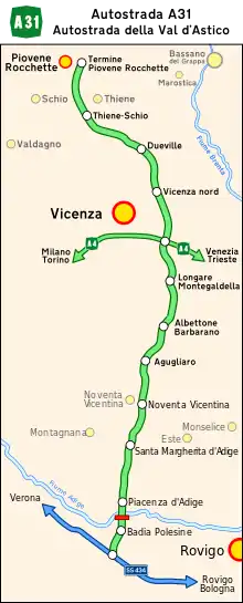 The Autostrada A31 is an Italian motorway which connects the trunk road SS434 "Transpolesana" (near Badia Polesine) with the town of Piovene Rocchette. The A31 is interconnected with the A4 motorway in the city of Vicenza. It is also known as the "Autostrada Valdastico" or "Autostrada della Val d'Astico".