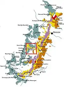 Auxey-Duresses wine is produced in the commune of Auxey-Duresses in Côte de Beaune of Burgundy. The Appellation d'origine contrôlée (AOC) Auxey-Duresses may be used for red and white wine with respectively Pinot noir and Chardonnay as the main grape variety. The production consists of around two-thirds red wine, and one-third white wine. There are no Grand Cru vineyards within Auxey-Duresses. The AOC Auxey-Duresses was created in 1970. Before the introduction of the appellation system in the 1930s, wines from this village were probably sold under the names of the more famous neighbors Volnay and Meursault. Later, the wines have been sold as Côte de Beaune-Villages, but it has progressively become more common to actually use the Auxey-Duresses AOC for the wines.[1]