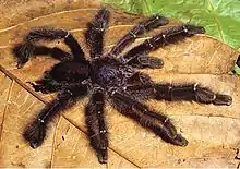 In daylight this spider discloses a quite intense purple-blue iridescence on the dorsal surface of the cephalothorax and on legs, palps and chelicerae. The long setae covering the legs and palps are dark red-brown. The tarsal and metatarsal scopulae are very dark brown. The tarsal tufts are pale cream-pink in colour. The abdomen is velvet-black and covered with stinging hairs.[2][4]