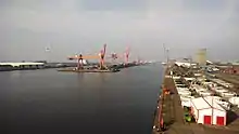 ![]() The docks, as seen from St Andrews Road. The coal loading silos can be seen on the left, with the Avonmouth container terminal on the right | |