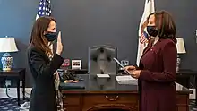 - ↑ Harris, Kamala [@VP] (January 21, 2021). "Earlier today, I swore in our first Cabinet member, Avril Haines, after her confirmation by the Senate last night. As the Director of National Intelligence, Director Haines will be dedicated to keeping the American people safe" (Tweet). Retrieved January 28, 2021 – via Twitter.