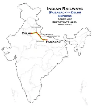 The 14205 / 14206 Ayodhya - Delhi Express is a train which runs between Ayodhya and Delhi. Though there are several trains that run to Delhi via Ayodhya, Ayodhya – Delhi Express is the only train which starts at Ayodhya to Delhi. It runs daily from Ayodhya to Delhi and from Delhi to Ayodhya.