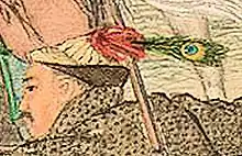 Ayusi leading the charge against the Dzungar camp at Gadan-Ola in 1755. By Giuseppe Castiglione.[6] Ayusi's troops numbered around 20, and wore the Dzungar headgear with the addition of a green peacock feather for differentiation.