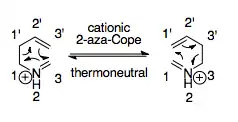 The cationic 2-aza-Cope rearrangement, most properly called the 2-azonia-[3,3]-sigmatropic rearrangement, has been thoroughly studied by Larry E. Overman and coworkers. It is the most extensively studied of the aza-Cope rearrangements due to the mild conditions required to carry the arrangement out, as well as for its many synthetic applications, notably in alkaloid synthesis. Thermodynamically, the general 2-aza-Cope rearrangement does not have a product bias, as the bonds broken and formed are equivalent in either direction of the reaction, similar to the Cope rearrangement. The presence of the ionic nitrogen heteroatom accounts for the more facile rearrangement of the cationic 2-aza-Cope rearrangement in comparison to the Cope rearrangement. Hence, it is often paired with a thermodynamic sink to bias a rearrangement product.[1]