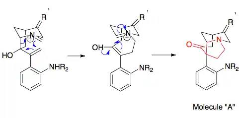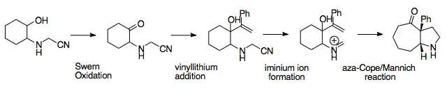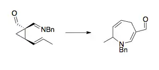 Horowitz and Geissman's first example demonstrates a possible thermodynamic sink to couple with the cationic 2-aza-Cope rearrangement, where the product is biased by the phenyl substituent through aryl conjugation, then captured by hydrolysis of the iminium. Other methods of biasing a product include using substituents which are more stable on substituted carbons, releasing ring strain (for instance, by pairing the rearrangement with cyclopropane opening), intramolecular trapping (pictured), and pairing the rearrangement with the Mannich cyclization.[1][15]