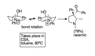 For simple aza-Cope/Mannich reactions that do not participate in ring-expanding annulation, namely condensations of amino alcohols and ethers, bond rotation occurs more quickly than the Mannich cyclization, and racemic products are observed.[14] This can be avoided by using a chiral auxiliary substituent on the amine. Reactions tethered to rings cannot undergo these bond rotations.[1]
