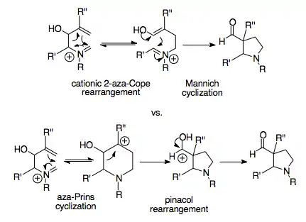 The general product of the reaction can potentially occur via two separate pathways: the aza-Cope/Mannich reaction, or an aza-Prins cyclization/pinacol rearrangement. These mechanisms have different stereochemical properties, which elucidate the dominance of the aza-Cope/Mannich reaction. The aza-Cope/Mannich reaction forces each atom in the [1,5] diene analog to undergo sp2 hybridization, erasing the starting material's stereochemistry at the labelled R' position, while the aza-Prins/pinacol rearrangement retains stereochemistry at the labelled R' position, pointing to a simple test that reveals the active mechanism. An enantiomerically pure starting material at the "R'" position should lead to a racemic product if the dominant mechanism is the aza-Cope/Mannich reaction, while the stereochemistry should be retained if the dominant mechanism is an aza-Prins cyclization/pinacol rearrangement pathway. A simple experiment verified that the product was racemic, providing clear evidence of the aza-Cope Mannich reaction as the operative mechanism. Further experiments verified this, using the knowledge that the carbenium ion formed in an aza-Prins/pinacol pathway would be effected by its substituent's ability to stabilize its positive charge, thus changing the reactivity of the pathway. However, a variety of substituents were shown to have little effect on the outcome of the reaction, again pointing to the aza-Cope Mannich reaction as the operative mechanism.[14] Recent literature from the Shanahan lab supports the rare aza-Prins/pinacol pathway only associated with significantly increased alkene nucleophilicity and iminium electrophilicity.[1][6][18][19]