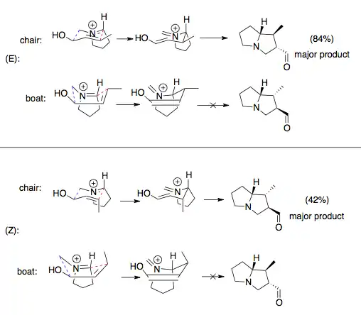 The cationic 2-aza-Cope rearrangement is characterized by its high stereospecificity, which arises from its high preference for a chair transition state. In their exploration of this rearrangement's stereospecificity, Overman and coworkers used logic similar to the classic Doering and Roth experiments,[8] which showed that the Cope rearrangement prefers a chair conformation.[9] By using the cationic 2-aza-Cope/Mannich reaction on pyrrolizidine precursors, they showed that pyrrolizidines with cis substituents from E-alkenes and trans substituents from Z-alkenes are heavily favored, results that are indicative of a chair transition state. If a boat transition state was operative, the opposite results would have been obtained (detailed in image below).[9] As is the trend with many reactions, conversion of the Z-enolate affords lower selectivity due to 1,3 diaxial steric interactions between the enolate and the ring, as well as the fact that substituents prefer quasi-equatorial positioning. This helps explain the higher temperatures required for Z-enolate conversion.[6][9] The boat transition state is even less favored by the cationic-2-aza-Cope rearrangement than it is for the Cope rearrangement: in analogous situations to where the Cope rearrangement takes on a boat transition state, the aza-Cope rearrangement continues in the chair geometry.[1][6][10] These results are in accord with computational chemistry results, which further assert that the transition state is under kinetic control.[11]