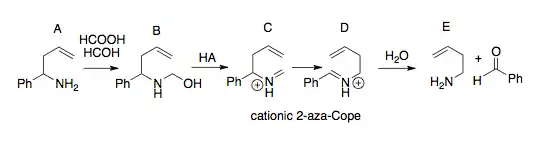 In 1950, Horowitz and Geissman reported the first example of the 2-aza-Cope rearrangement, a surprising result in a failed attempt to synthesize an amino alcohol.[2] This discovery identified the basic mechanism of the rearrangement, as the product was most likely produced through a nitrogen analog of the Cope rearrangement. Treatment of an allylbenzylamine (A) with formic acid and formaldehyde leads to an amino alcohol (B). The amino alcohol converts to an imine under addition of acid (C), which undergoes the cationic 2-aza-Cope rearrangement (D). Water hydrolyses the iminium ion to an amine (E). Treating this starting material with only formaldehyde showed that alkylation of the amine group occurred after the cationic 2-aza-Cope rearrangement, a testament to the quick facility of the rearrangement.[2]