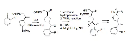 Overman's synthesis of strychnine represents a useful example of the preparation of precursors necessary for the aza-Cope/Mannich rearrangement, representing effective usage of an epoxide ring opening. The key steps of the synthesis of the rearrangement substrate leading to the starting materials necessary for the aza-Cope/Mannich reaction included a Stille reaction to piece together two precursors, an epoxidation of a double bond using tert-Butyl hydroperoxide, a Wittig reaction to convert the ketone to an alkene, and a cyclization step. Amine alkylation (not shown), transforms the molecule to the rearrangement substrate. Significantly, this molecule shows the enantiomeric precision of the aza-Cope/Mannich reaction, as a simple enantiomeric starting material dictates the final enantiomer: the enantiomer of strychnine was produced by using the enantiomer of the starting material.[20][21]