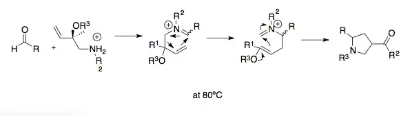 This first report of the reaction was a reaction between aldehydes and 2-alkoxy-3-butenamines, which formed an amino alcohol whose aza-Cope/Mannich reaction product was an acyl-substituted pyrrolidine ring. This simple procedure only involved mild heating for several hours. Significantly, the aza-Cope/Mannich reaction occurs in a single step with excellent yield. This procedure is easily applied to condensation of amino ethers (shown below), where the alcohol has been methylated first.[16] After the aza-Cope/Mannich reaction is carried out, the ketone is formed by addition of NaOH.[16] The amine, in this simple case, cannot form the iminium ion from basic ketones; subsequent methods found ways of incorporating ketones into the reaction.[16][17] The utility of this reaction is evident in the fact that even when a less stable isomer is formed, the reaction proceeds, demonstrating its high thermodynamic favorability.[12][17]