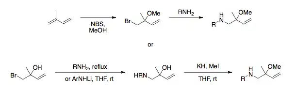 The ring strain of epoxides provide useful methodology for installation of an amine group two atoms away from an alcohol group. The epoxide may be first broken by bromide nucleophilic attack. Primary amines, aromatic amines, or lithium anilides can also be used as nucleophiles. Protective O-methylation often follows this step and proceeds easily.