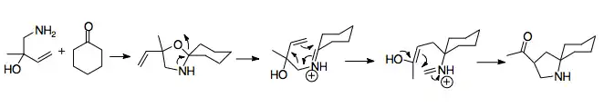 Ketones and sterically hindered aldehydes are not suitable for the basic aza-Cope/Mannich reaction, as the amine cannot form an iminium ion with them. Dehydrative oxazoline formation followed by heating in the presence of a full equivalent of acid present a way to get around this issue. Overman has reported the use of oxizolidines to generate the iminium ion requisite for the reaction. Upon formation, Overman showed that cyclohexanones can be used for the carbonyl component in pyrrolidine synthesis.[17] This reaction proceeded with various forms of cyclohexanones. When an acyclic ketone was substituted, the reaction proceeded with low yield, highlighting the thermodynamic favorability of releasing cyclohexanone from the double bonded carbonyl, as it creates unfavorable bond strain in the chair conformation. This represents one of the most convenient constructions of the 1-azaspiro[4,5]decane ring system, a useful natural product.[17]