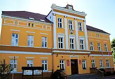 Over the next centuries, the town slowly recovered: in 1750, it had about 1,500 inhabitants, and more than 3,500 in 1850, occupied primarily with agriculture.[11] From that period, several 18th-century timber framed buildings and the early 19th-century town hall are preserved.[7] During the Napoleonic Wars and Polish national liberation fights, in 1807, French and Polish troops marched through the town.[12] When the Kingdom of Prussia reformed her administrative organization after the Napoleonic Wars, the town became part of the Province of Brandenburg created from the territory of the former margraviate. In 1853 a railroad connected it with Kostschin (Kostrzyn). Twenty- three years later the town was connected with Stettin (Szczecin). From 1871 to 1945, the town was also part of Germany. During World War II, under Nazi Germany, forced laborers, mostly Poles, worked in the town.[13] The town was captured on 4 February 1945 by the Red Army during the Vistula–Oder Offensive in the final period of World War II, and as it was east of the Oder-Neisse line, became again part of Poland. Only 30% of the town was destroyed.[14] The remaining inhabitants were expelled and the town was resettled by Poles, including settlers from Central Poland and expellees from former Eastern Poland (Kresy).[8] Bärwalde was first renamed Barwice, later Mieszkowice after Mieszko I of Poland.[15] The final name was chosen for political purposes: the Communist regime sought to legitimize its presence at the Oder by referring to the medieval Piast dynasty, whose territory had also extended to the Oder, and propagated the "return" to ancient Polish lands.[8] To that effect, a legend was popularized in Mieszkowice, linking the town's foundation to a hunting expedition of Mieszko I: Allegedly, the town was founded at a spot where Mieszko once slew two bears.[6] In 1957, a statue of Mieszko I created by Sławomir Lewiński was unveiled on the town square.[6]