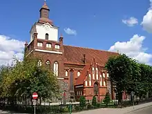 The first record of Bärwalde is a 1295[6] deed under the name of Berenwalde. Most likely, the settlement was owned by a knight of the von Behr family.[6][2] The settlement was developed following a grid of rectangular streets with a central market place.[2] In 1297, St. Mary's Church was first mentioned,[7] and another document gives 1298 as the year when Bärwalde was granted German town law.[6][2] In the late 13th and early 14th century the city walls were constructed,[8] much of which still exist, while the city gates were pulled down in 1867.