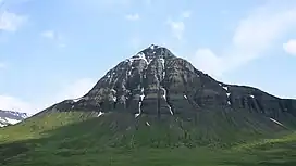 Búrfellshyrna (Icelandic pronunciation: [ˈpurˌfɛlsˌhɪ(r)tna] ⓘ) is a mountain in the Svarfaðardalur in northern Iceland. It is made of basaltic layers of Tertiary age. It reaches 1,091 meters at its highest peak. It is situated between the valleys of Búrfellsdalur and Grýtudalur. In Búrfellsdalur is the Búrfell Glacier, which exhibits what is sometimes referred to as a glacier surge. Farms surrounding Búrfellshyrna include Búrfell and Hæringsstaðir.
