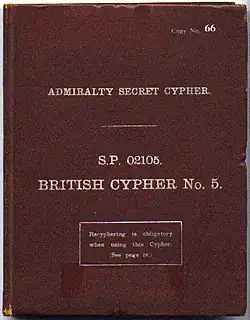 67. 1 2 3 4 5 6 7 "Review of security of naval codes and cyphers – September 1939 to May 1945". The National Archives, Kew. ADM 1/27186. Signal Division, Admiralty. November 1945. pp. 69–74. Retrieved 3 October 2016. Public Domain This article incorporates text from this source, which is in the public domain.