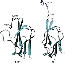 Three-dimensional structures of two biotin domains. The structures of the biotin domains from the biotin carboxyl carrier protein (BCCP) of (left) Escherichia coli acetyl CoA carboxylase and (right) the 1.3S subunit of Propionibacterium freudenreichii subsp. shermanii transcarboxylase (TC).