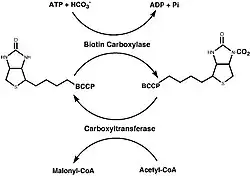 The synthesis of Malonyl-CoA consists of two half reactions. The first being the carboxylation of biotin with bicarbonate and the second being the transfer of the CO2 group to acetyl-CoA from carboxybiotin to allow for the formation of malonyl-CoA. Two different protein subassemblies, along with BCCP, are required for this two step reaction to be successful: biotin carboxylase (BC) and carboxyltransferase (CT). BCCP contains the biotin cofactor which is covalently bound to a lysine residue.[5]