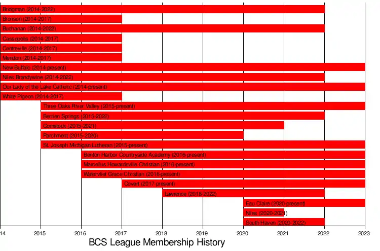 Between 2017 and 2021, the BCS experienced frequent membership changes with eight schools departing & five schools joining. A final attempt to realize its "super-conference" aspiration was attempted in 2019, when membership invitations were extended to ten schools of diverse enrollments.[3] Niles and South Haven were the only two that accepted. However, Niles departed after only a single season and South Haven exited after two seasons. When expansion proved unsuccessful, the remaining larger schools decided to leave for other conferences.[4] Beginning with the 2022-2023 season, the BCS transitioned into being a league catering to small public and private schools in southwest Michigan.