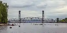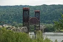 The BNSF Railway Bridge 5.1,[2][4] also known as the St. Johns Railroad Bridge[2][4][5] or the Willamette River Railroad Bridge,[6] is a through truss railway bridge with a vertical lift that spans the Willamette River in Portland, Oregon, United States. Built by the Spokane, Portland and Seattle Railway (SP&S) and completed in 1908, it was originally a swing-span bridge, and its swing-span section was the longest in the world at the time.[6][7] However, 81 years later the main span was converted from a swing-type to a vertical-lift type, in order to widen the navigation channel. The lift span is one of the highest and longest in the world.[2] The bridge consists of five sections, with the two sections closest to the bank on each side fixed.
