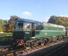 The locomotives were based on the Sulzer Type 2 locomotives that BRCW had built for the Scottish Region of British Railways.[29] The cabs were altered slightly, with the centre section housing a two figure route indicator.[30] They were built at BRCWs Smethwick works. The underframe and bodysides form an integral superstructure. The cabs are double skinned, with driving controls both sides to make shunting easier. The roof is of glass reinforced plastic. Bogies are identical to those used on the Sulzer Type 2, with SKF roller bearings and brakes on all wheels. The handbrake works on the inner set of wheels of each bogie.[31] The engine is a Sulzer 8LDA28 diesel engine, built by Vickers-Armstrong at Barrow-in-Furness, Lancashire. It has eight cylinders of 280 mm bore by 360 mm stroke and develops 1,550 horsepower (1,160 kW) at 750 rpm. a Sulzer de Havilland LAG 37-17 turbocharger is fitted.[32] The main generator is a Crompton Parkinson CG391-B1.[33] The locomotives are fitted with dual air and vacuum brakes and can work in multiple with any other "blue star" locomotives.[34]
