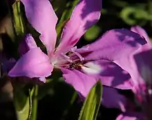The shapes and colour patterns of the flowers vary across species and are adapted to specific pollinators. As in the last common ancestor of all Babiana species, the flowers of most extant species are mirror symmetrical with an upper and lower lip, and three parallel curved stamens in the upper lip. B. angustifolia, B. inclinata, B. rubrocyanea and B. secunda have inverted flowers. Although the corolla is radially symmetric in B. rubrocyanea, the stamens are still parallel and crowded at one side of the flower. Several other species also have star symmetrical flowers with the anthers crowded or not. B. pigmea and B. radiata, two species that are not related to B. rubrocyanea also have star symmetrical flowers, which must have been an independent development. The tepals are approximately of equal length in most species, but in species with a zygomorphic perianth the dorsal tepal is wider and arched over the three stamens, so forming the upper lip, while the three lower tepals form the lower lip, a landing stage for pollinators. The lower tepals are often joint to the upper lateral tepals at their base, creating a more pronounced landing stage. The dorsal tepal in the flowers of B. ringens and B. hirsuta is very much longer than the other tepals, and their edges curve inwards to loosely enclose the filaments. In the species assigned to the section Antholyzoides, initially the dorsal tepal is hood-shaped but it becomes erect or recurved in the older flower. The dorsal and usually also the other tepals are also more or less clawed in this section. Towards its base, the perianth is entire. It may be funnel-shaped with a narrow cylindrical lower part, or the tube may be approximately cylindrical over its entire length (in B. brachystachys and B. tubulosa), but it may also expand abruptly forming a wide cylindrical throat (in B. hirsuta and B. ringens). The length of the perianth tube varies strongly between species, from approximately 10 mm (0.39 in) to over 80 mm (3.1 in). The length of the floral tube often reflects the length of the mouth parts of the pollinator. However, in Babiana the floral tube is sometimes entirely blocked by the style. A blocked floral tube most commonly occurs in species that have a their stems largely underground. The solid tube serves as if it is a pedicel, so that the flowers are raised above the leaves. Typically, part of the floral tube is completely closed in species with actinomorphic flowers. These species are mostly pollinated by monkey beetles. The floral tubes in these species may be long, in some forms of B. villosa even up to 35 mm (1.4 in). The flowers of these species hardly produce any nectar. The last common ancestor of all Babiana species most likely had blue or violet flowers, still the most common colours in the extant species, with the lower laterals bearing spear- or lozenge-shaped, white or cream-coloured markings strongly contrasting with a dark blue, purple or red outline. In some species the lower central tepal is marked in the same way. A few species, in particular B. noctiflora, B. odorata, B. pygmaea, B. spathacea, B. tubulosa, B. unguiculata and B. virginea flowers are white, cream-coloured or pale yellow. The flowers of B. brachystachys are white on the inside but pink on the reverse. Few other species have magenta flowers, including B. blanda, B. purpurea and B. rubella. The aptly named B. carminea has carmine-coloured flowers. Scarlet flowers can be found in B. hirsuta, B. ringens and a form of B. villosa, pinkish red in B. avicularis. B. regia and B. rubrocyanea have an actinomorphic dark blue perianth around a red heart divided by a thin white line. The flower colour of B. nervosa differs considerably between populations from white to cream-coloured, pink, mauve or blue, and within most populations the flower colour is uniform but for the weakly contrasting markings on the lower tepals. The stamens are implanted where the tube widens. The filaments are slender and extending outside the mouth of the flower. B. leipoldtii and B. villosula however have actinomorphic flowers in which the stamens do not reach beyond the upper half of the tube. In B. ringens, B. hirsuta and B. avicularis on the other hand, the anthers are well-exerted, reaching beyond the tip of the dorsal tepal that is loosely embracing the filaments.[1]