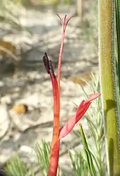 Babiana ringens, the rat's tail, is a flowering plant endemic to Cape Province of South Africa.[1] The foliage is long and erect with an inflorescence consisting of a sterile main stalk adapted for ornithophily, pollination by birds. The plant bears bright red, tubular flowers on side branches close to the ground. It is a perennial that grows in nutrient-poor sandy soil[2] and flowers during the winter rains.[3]