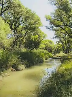 The Babocomari River is a major tributary of the upper San Pedro River in southeastern Arizona. The river begins in the Sonoita Basin near the community of Elgin, Arizona, and flows eastward for approximately 25 miles (40 km) before merging with the San Pedro, just south of the Fairbank Historic Townsite in the San Pedro Riparian National Conservation Area. The Babocomari drains an area of about 310 square miles (800 km2), including the northern Huachuca Mountains, the northwestern Canelo Hills, and the southern Mustang Mountains, and is one of three drainages of the Sonoita Basin, the other two being Sonoita Creek and Cienega Creek. Vegetation consists of riparian trees along the main channel and small marshy grasslands.[2]