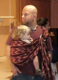 Babywearing is the practice of wearing or carrying a baby in a sling or in another form of carrier. Babywearing has been practiced for millenia[1] around the world. Babywearing is a form of baby transport which can be used for as long as mutually desired, often until toddlerhood and beyond.[2] In the industrialized world, babywearing has gained popularity in recent decades. Part of the reason for this shift is due to the influence of advocates of attachment parenting.