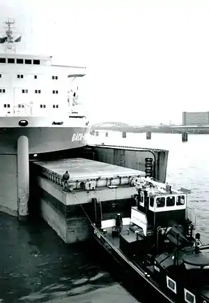 ![]() A barge being loaded into a Baco Liner ship in 1994 | |