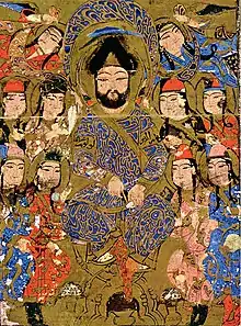 In the miniatures, Lu'lu' wears the Turkic military furred hat, the Sharbush (Harbush).[19] He also wears a gold brocaded Turkic tunic (qabā` turki), with țirāz arm bands on which his name is clearly inscribed.[20] He has red leather boots with stamped gold decorations.[21] Most of his attendants wear the Turkic dress, with Turkic coat, boots and headress.[21]