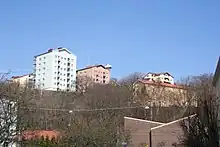 Bagaregården hilltop as seen from Stockholmsgatan. Redbergskyrkan on the bottom right