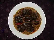Baghāre baingan (Urdu: بگھارے بیگن ) is a curry from the Hyderabadi cuisine made with eggplant (brinjal) Hyderabad. It is also used as a side dish with the Hyderabadi biryani.