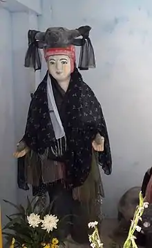 Bago Medaw (also known as the Buffalo Mother or Lady Buffalo; Burmese: ပဲခူးမယ်တော်, IPA: [bəɡó mɛ̀dɔ̀] or နံကရိုင်းမယ်တော်, IPA: [nàɰ̃kəɹáiɰ̃ mɛ̀dɔ̀]) is a Burmese nat commonly venerated in the vicinity of Bago (although worship is seen throughout Lower Burma).[1] Bago Medaw is depicted as a maiden wearing a water buffalo skull, representing a female buffalo named Nakkarai, that nursed Prine Ashakuma, son of Thamala, the traditional founder of Hanthawaddy (now Bago).[2][3][4] She is believed to protect the family and home, and grant wishes to those she favors.[4]