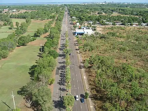 Bagot Road is a major arterial road in Darwin, Northern Territory Australia. The road forms part of the main transport route between the Central Business District, northern suburbs and Darwin International Airport. The origins of the name Bagot Road is believed to be in reference to the Bagot family of South Australia, who had significant land holdings in the early Northern Territory.[1] In 2010, the road was used by an average of 34,487 vehicles per day.[2] Due to the high traffic volumes, a number of major retailers and fast food outlets are situated along Bagot Road. Darwinbus Route 10 and Orbital Link services travel the length of Bagot Road with frequent stops in both directions.[3]