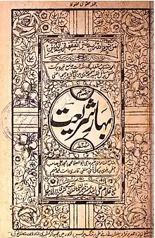 Bahar-e-Shariat (Urdu: بہارِ شریعت; 1939) is an encyclopedia of Islamic fiqh (jurisprudence), according to the Hanafi school. Spreading over 20 volumes, Seventeen of its volumes were written by Amjad Ali Aazmi, a disciple of Ahmed Raza Khan. The final three books were compiled by his disciples after his death. The book is written in simple Urdu and has 11,624 topics.[1][2]