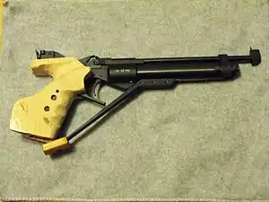 The IZh-46M is a competition-grade, single-shot pneumatic air gun, with a hammer-forged, rifled barrel, designed for the 10 metre air pistol ISSF shooting events. The gun is charged with a single stroke of an underlever cocking arm.