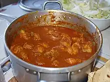 Its ingredients could include prawns, oil, onions chopped fine, tomatoes, garlic paste or cloves, ginger paste or ginger, dried red chillies, cumin seed, mustard seeds, cinnamon, cloves, sugar, vinegar and salt.[2]