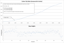 The tallest single step measures approximately 20 inches (51 cm) (located adjacent to the only intermediate landing without a curved bench for resting). The average step height is 10.5 inches (27 cm), and the shortest is 3.5 inches (8.9 cm). An information sign posted at the trail entrance near the intersection of Jefferson Blvd. and Hetzler Rd. states that the staircase is 715 feet (218 m). In the center of the landing between the 247th and 248th steps is a bronze marker stating the elevation, surrounded by two semi-circular engravings: