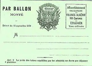 Historically, balloons were used to transport mail from Paris during the Siege of Paris of 1870–1871. About 66 unguided mail balloons were released from Paris to communicate with the outside world; the great majority succeeded in delivering their cargo. As Prussian forces surrounded the city, telegraph lines were cut and messengers were captured, shot or turned back. Two services were proposed: ballon monté (manned balloon) and ballon non-monté (unmanned).[1] In practice only manned flights were used. After the siege, Anglo-French scientist Dr Pierre Wesby travelled to Burton-on-Trent, where in 1873 he started a business to transport mail from England across the Irish Sea to Dublin. It is not known how this venture turned out; the records of Wesby's company were lost in 1916 when a bomb from the Zeppelin L 19 destroyed them.