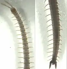 Centipedes in this genus range from 1 cm to 7 cm in length and have 37 to 91 pairs of legs.[2] The Asian species Ballophilus pallidus measures only 11 mm in length and can have as few as 37 leg pairs (37 or 39 pairs in males, 41 in females), the minimum number found in this genus.[4] The species B. fijiensis can reach 52 mm in length and can have 81 to 91 leg pairs, the maximum number found in this genus.[5]