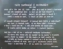 Inscription on the gravestone for Tadhg Gaelach Ó Súilleabháin originally composed by Donnacha Rua in Latin (carved on the gravestone) and translated to Irish shown on the black plaque (above) by teacher Tom Walsh around 1910.