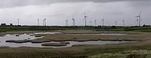 Ballywater Wind Farm across a salt marsh near Ballinoulart Beach