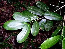 Leaves are thick and glossy, 7–13 cm (3–5 in) long. They are opposite, simple, not toothed, mostly oblong in shape, though at other times elliptical or oval. Identification of this species is made easier when noticing the blunt leaf point and nearly horizontal leaf veins. At the base of the leaf are two swollen glands. Leaf stalks are 8 millimetres (0.31 in) long, and somewhat channelled on the upper side.[4]