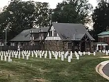 The area of the Baltimore National Cemetery was once part of an elevated site in Baltimore, referred to as early as 1750 as the Cloud-Capped estate. It was originally owned by the Baltimore Company and Charles Carroll of Carrollton. In 1890 it was acquired by Blanchard and Susan Randall. When the nearby Loudon Park National Cemetery was deemed full, the War Department surveyed the area for a new site. In 1936 the federal government took possession of the land for a cost of $95,000, and began converting the estate to "Little Arlington". The old mansion was demolished, fences were put up, roads were constructed, and landscaping was done as part of a Works Progress Administration to invest in infrastructure during the Great Depression. The first interment took place on December 22, 1936, but the cemetery was not formally dedicated until May 30, 1941.[2] In 2019, The Durable Restoration Company provided restoration of the exterior Tudor style stone facade and slate roof.